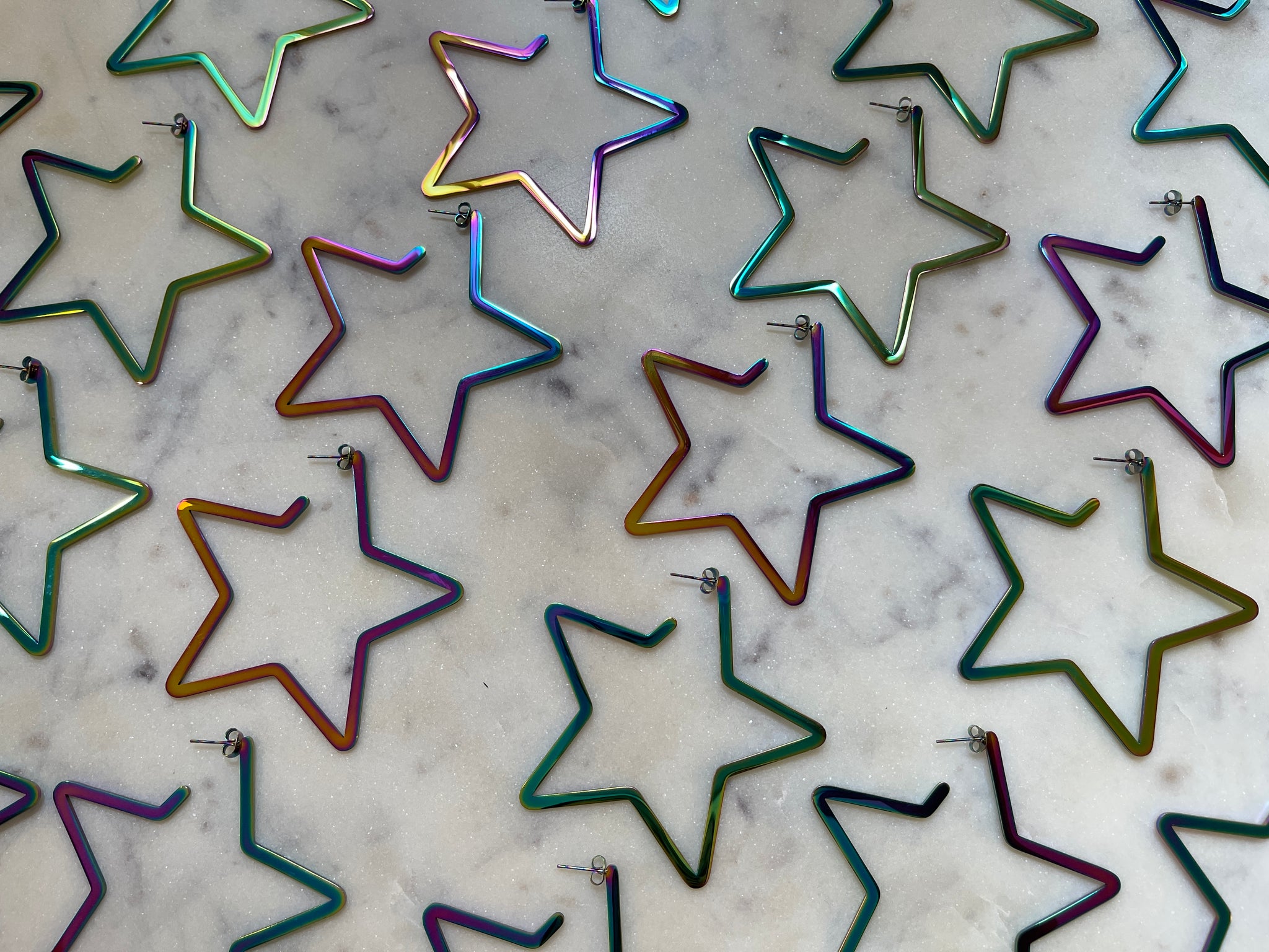 Our timeless Iconic Star Hoops were designed to turn heads! This delicate pair of hoops are a classic staple that should be a part of every fashionista's jewelry collection. Allie and Mickey jewelry is crafted with the finest 14K gold coating with rich hues that reflect the light in various ways, which means that every customer of Allie and Mickey can expect a one of a kind piece. .